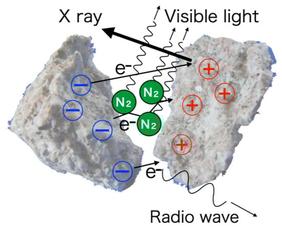 These experimental results suggest that electrical processes are important, but there is a wide variety of mechanisms that have been proposed, for example, electrostatic discharge produced by the deformation of piezoelectric minerals [3,5,12,15], electrification by contact or separation of the fresh surface [1,6,7,8,11], excitation of the ambient atmosphere via bombardment with charged particles from fresh fracture surfaces [10,11,13], and streaming electrification involving micro-cracked rocks containing capillary water [1,16].