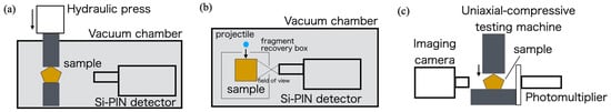 During X-ray measurements, two methods were used to disrupt the rock and mineral samples: uniaxial compression by a hydraulic press (Figure 2a) and impact by hypervelocity projectiles using a two-stage light-gas gun (Figure 2b). In both methods, the X-rays generated during fracture were detected using a Si detector (XR-100CR, AmpTek, Bedford, MA, USA), (a detector size of 5 mm in diameter) with a Be window (thickness 25.4 μm).