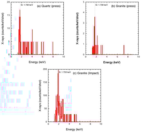 For quartz and granite, a peak around the energy of the Si line (1.739 keV) is observed. Based on the spectra shown in Figure 3, we consider the X-ray counts in the energy range of 1.6 to 1.9 keV to correspond to the Si line. Because the resolution of this detector Γ is ~0.2 keV FWHM (full width at half maximum), if the profile of the line is ideally Gaussian, the standard deviation σSi is represented as Γ/(2(2ln2)1/2) = 0.085 keV. Hence, this energy range corresponds to ~2σSi. For press disruption, the counts of the Si line between 1.6 to 1.9 keV for quartz and granite are 54 and 5.7 counts per shot, respectively. Multiplying the energy of bin-size (0.035 keV), the number of photons is obtained to be 1.9 and 0.2 photons per shot, respectively. The counts for impact granite disruption are 580 counts per shot, corresponding to 20.3 photons per shot.