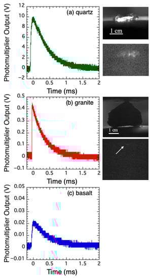 Figure 4 shows the typical PM signals during the disruption as a function of time for (a) quartz, (b) granite, and (c) basalt. The images of the samples before fracture and light emission are also shown, with the exception of the basalt sample (no light was recognized by the imaging camera, likely as a result of weak intensity). The duration of emission is less than 1 ms in each case. The PM signals and images in our experiments are summarized in Figures S3−S7 in Supplementary Materials. It should be noted that we also conducted the visible-light measurements with quartz and granite samples placed between polyvinyl chloride (PVC) plates as insulators to check the dependence of the results on the material used to sandwich the sample. The PM signals for quartz and granite samples between PVC plates show that the visible-light emission is the same order as without PVC plates (Figure S8 in Supplementary Materials). Hence, we conclude that the results do not depend on the materials between which the sample is placed and the subsequent evaluation will be based on the results obtained without the insulator plates.