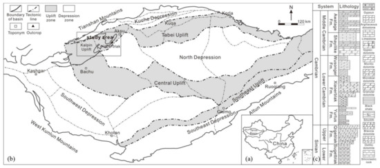 The Tarim Basin in southern Xinjiang, China (Figure 1a), is a multi-cycle petroliferous basin superimposed by the Paleozoic cratonic basin and the Mesozoic and Cenozoic foreland basins [21], covering an area of 56 × 104 km2. According to the current division of tectonic units, the basin is composed of seven first-order tectonic units, including Tabei Uplift, Central Uplift, Southeast Uplift, Kuqa Depression, North Depression, Southeast Depression and Southwest Depression (Figure 1b). The Xiaoerblak outcrop is found in the northwest margin of the basin, about 50 km southwest of Aksu, and is a part of the eastern segment of the Keping fault-uplift in the Tabei Uplift [22,23].