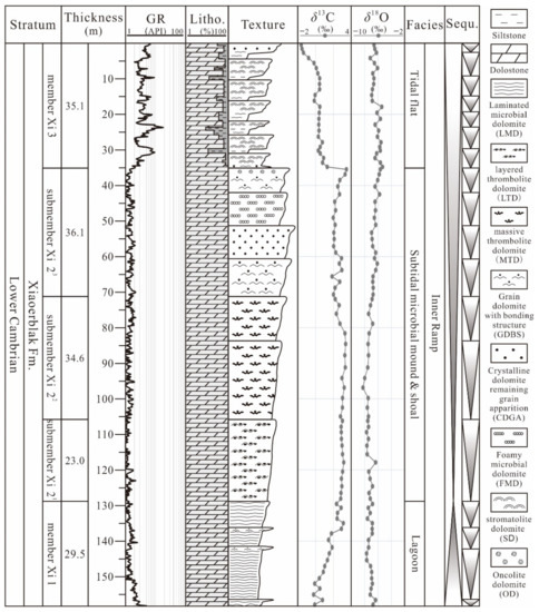 - The Xiaoerblak Formation mainly develops nine types of dolomites, i.e., laminated microbial dolomite, layered thrombolite dolomite, massive thrombolite dolomite (MTD), grain dolomite with bonding structure, crystalline dolomite remaining grain apparition, foamy microbial dolomite, stromatolite dolomite, grain dolomite with clay and argillaceous dolomite. According to the lithofacies association, it can be divided into three members: Xi 1, Xi 2, and Xi 3, of which member Xi 2 is subdivided into three submembers—the thickness is about 158.3 m;