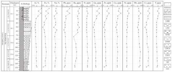 Element geochemistry of carbonate rocks can illustrate sedimentary and diagenetic conditions, such as paleoclimate, redox environment, and water depth [34]. As shown in Table 2, all samples exhibit an MgO/CaO value close to 0.71, varying from 0.694 to 0.722. Except for two clay-bearing dolomite samples (72–1 and 81–1) with relative low MgO + CaO value (40.05–31.64%), the remaining samples have an MgO + CaO value from 50.75% to 52.08%, indicating a high purity. The contents of Al, Fe and Na are relatively high and vary greatly—Al: 100–9090 ppm, avg. 1079 ppm; Fe: 210–15740 ppm, avg. 2428 ppm; Na: 240–1050 ppm, avg. 527 ppm. The contents of Sr and Mn are medium and vary slightly—Sr: 72.8–159.1 ppm, avg. 99.2 ppm; Mn: 90–373 ppm, avg. 196 ppm. The contents of V, Cr, Ni, Cu, Ga, Ba and Pb are low, with average values of less than 10 ppm. From bottom to top, the contents of Sr, Na, Ba, Ni, Mn, Cr and V are relatively stable or slightly increase, and the contents of Al, Fe, Pb, Ga, Zn and Cu tend to decrease slowly and then increase rapidly (Figure 6).