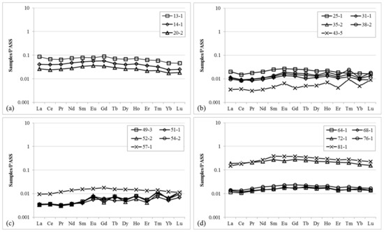 Normalized REEs distribution patterns of dolomite in Xiaoerblak Formation dolomite: (a) member Xi 1; (b) submember Xi 21 and Xi 22; (c) submember Xi 23; (d) member Xi 3.