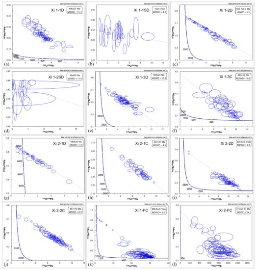 LA-MC-ICP-MS U-Pb concordia diagram of dolomite in Xiaoerblak Formation carbonate: (a) Microbial dolomite of sample Xi 1-1; (b) Saddle dolomite of sample Xi 1-1; (c) Microbial dolomite of sample Xi 1-2; (d) Saddle dolomite of sample Xi 1-2; (e) Microbial dolomite of sample Xi 1-3; (f) Sparry calcite of sample Xi 1-3; (g) Microbial dolomite of sample Xi 2-1; (h) Sparry calcite of sample Xi 2-1; (i) Microbial dolomite of sample Xi 2-2; (j) Sparry calcite of sample Xi 2-2; (k) Sparry calcite of sample Xi 1-FC; (l) Sparry calcite of sample Xi 2-FC.