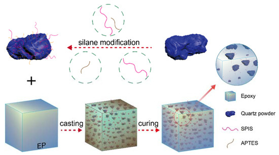 The bisphenol-A epoxy resin (NPEL-128, EP) was supplied by Nanya Electronic Materials (Kunshan) Co., Ltd., Kunshan, China. Methyl thetrahydrophthalic anhydride (MTHPA) was purchased from Jiaxing Qingyang Chemical Co., Ltd, Qingyang, China, and was used as a curing agent. QP was supplied by Triumph Quartz Material (Huangshan) Co., Ltd., Huangshan, China. APTES (chemical name: 3-aminopropyl triethoxysilane) and SPIS (chemical name: silylated polyazamide silane) were supplied by the Foshan Daokangning Chemical Co., Ltd, Foshan, China. The chemical structures of APTES and SPIS are illustrated in Figure 1. Ethanol and diiodomethane were purchased from Shanghai Aladdin Biochemical Polytron Technologies Inc., Shanghai, China. All chemicals were used without further purification.