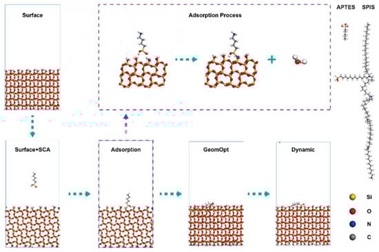 The molecular dynamics (MD) simulations were carried out by using the Forcite module incorporated in the Materials Studio 2021 (Accerlys software, San Diego, CA, USA). Three surface modules were constructed to study the adsorption characteristics of different SCAs. In this study, the quartz surface model (silica_Q3_4_7OH_5pct_ion) proposed by Emami et al. [32] was adopted. For APTES, the surface model was used without any further modification, and it was extended to a (2 × 2) supercell with a 140 Å vacuum slab above the modeled surface for the simulation of SPIS and the dual SCAs. The structural models of APTES and SPIS, along with the MD simulation of the SCAs, are shown in Figure 3. Moreover, the SCAs in the model were manually bonded to the quartz surface. For each simulation box, the MD simulations with a velocity scale thermostat of the NVT ensemble were used; the simulation time was 30 ps with a time step of 1 fs. A smart algorithm was used for the geometry optimization; the convergence thresholds for the energy, force, and displacement were set to 1 × 10−4 kcal·mol−1, 0.005 kcal·mol−1·Å−1, and 5.0 × 10−5 Å, respectively; and the COMPASS II [33] force field was adopted. Furthermore, the atom-based and Ewald [34] summation methods were adopted for the calculation of the van der Waals force and electrostatic energy. The cutoff distance for the van der Waals force was set to 15.5 Å, and the Ewald accuracy was set to 1 × 10−4 kcal/mol.