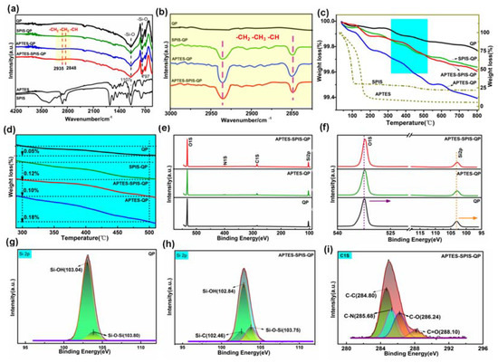 Surface coating analysis of the as-obtained samples. (a) FTIR spectra of the as-obtained samples. (b) Magnified images showing the absorption peaks of the organic functional groups, such as alkyl, –CH2, and –CH3 of the as-obtained samples. (c) TGA curves of the as-obtained samples. (d) Magnified TGA curves at 300–500 °C. (e) XPS spectra of the as-obtained samples. (f) Magnified spectra showing the O 1s and Si 2p peaks. (g) Si 2p spectrum of the pristine sample. (h) Si 2p spectrum of the sample modified by 2% APTES and 1% SPIS. (i) C 1s spectrum of APTES- and SPIS-modified sample.