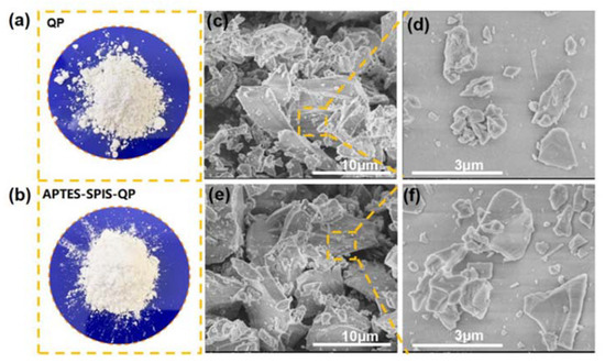 The contact angles of the QPs and EP were conducted by a JC2000D contact angle measuring instrument (Shanghai Powerach Digital Technology Equipment Co. Ltd., Shanghai, China). The QPs before and after modification were compressed at 6.5 Mpa for 2 min to obtain a cylinder with a diameter of 10 mm and thickness of 1.5 mm. The measurements were performed in a sessile drop mold, and water and diiodomethane were used as the wetting solvents.