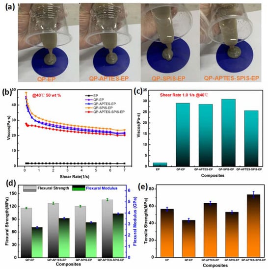 Mechanical properties of the neat EP and their composites. (a) Photographs of the flow properties of epoxy composites (b) Relationship between viscosity and shear rate. (c) Viscosity at a shear rate of 1.0 1/s. (d) Flexural strength and modulus. (e) Tensile strength.