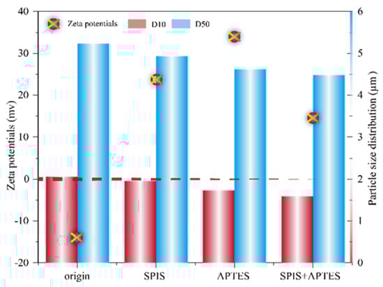 For the SCAs used in this paper, the above results showed that better aggregation reduction means better dispersity in an EP matrix and mechanical properties. As for the interfacial adhesion, whether it also had a clear correlation remained unknown, so a zeta potential measurement was carried out to study the adsorption configuration and analysis the interfacial adhesion. Zeta potential provides a reference for the electronic force between particles, and a higher zeta potential of the same polarity indicates a higher electronic force and higher stability among the particles [55]. The zeta potential of the QPs treated with different SCAs and that of the pristine QP were measured, and the corresponding results are shown in Figure 8. The zeta potential of the pristine QP was negative (−14.25 mV), and its absolute value was insufficient to reduce the aggregation of the QP. The average particle size and zeta potential of the APTES-modified QP were 4.62 μm and 33.96 mV, respectively. Compared to the APTES, the SPIS-modified QP had a 32.27% lower zeta potential and 6.71% higher average particle size. In the case of the dual SCAs, the dual SCAs decreased the average particle size of the QP by 3.03% and decreased the average zeta potential by 57.24% compared to APTES. After the SCA modification, the potential changed from negative to positive, which could be attributed to the positively charged amino group in the SCA molecule. For the single SCA, a higher electrostatic force exhibited a better dispersion; hence, the electrostatic repulsion seems to play a key role in the dispersion of QP. However, SPIS is a high-molecular-weight compound, and the aggregation of QP may be improved by its steric hindrance stabilizing effect. However, the results indicated that the steric hindrance stabilization effect was constrained. The dual SCA-modified QP showed a better dispersion result with a smaller zeta potential, which means the steric hindrance stabilization effect of SPIS appeared again by using the dual SCAs. The dual SCAs could produce the best dispersion with the lowest zeta potential; thus, the steric hindrance effect must play a dominant role for dual SCAs, and the steric effect of SPIS might be influenced by APTES. The zeta potential and average size analysis indicated that the mixture of dual SCAs produced a better dispersion of the QP, exhibiting a synergistic effect between the SCAs.