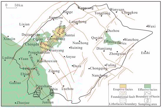 - Ma, X.; Li, G.; Ying, D.; Zhagn, B.; Li, Y.; Dai, X.; Fan, Y.; Zeng, Y. Distribution and gas-bearing properties of Permian igneous rocks in Sichuan Basin, SW China. Pet. Explor. Dev. 2019, 46, 216. [Google Scholar] [CrossRef]