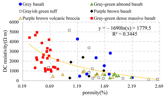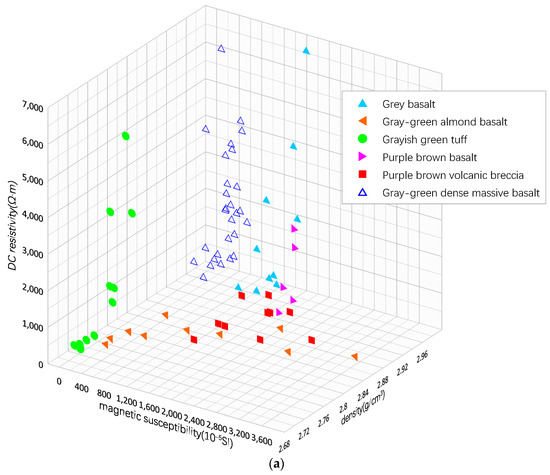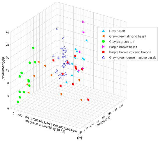 - The three-dimensional plot of the resistivity, density, and magnetic susceptibility, and the three-dimensional plot of the polarizability, density, and magnetic susceptibility show that the distribution characteristics of the physical parameters of the igneous rocks with different lithologies are distinct, and these plots can be used as an important basis for identifying igneous rocks with different lithologies. The relationships between the physical parameters and reservoir parameters established for the study area reflect the porosity distribution range of the different lithologies and provide effective parameters for igneous reservoir evaluation.