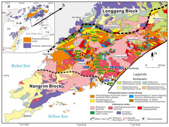 (a) Sketch map showing the tectonic units of the North China Craton (after [3]). (b) Geological map of the region from the Liaodong Peninsula to southern Jilin Province (modified after [5]). Abbreviations: EB, Eastern Block; JLJB, Jiao-Liao-Ji Belt; LGB, LongGang Block; LJB, Lmjingang Belt; NRB, Nangrim Block; QZSZ, Qinglongshan-Zaoerling shear zone; SLB, Su-Lu ultrahigh-pressure belt; TNCO, Trans-North China Orogen; GB, Gyeonggi Block; WB, Western Block; YB, Yeongnam Block.