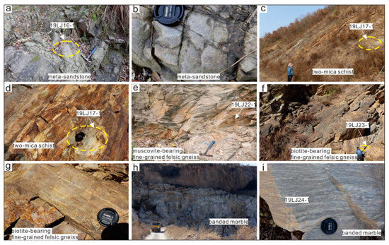 Field photographs of meta-sedimentary rocks of the Gaixian Formation. (a,b) Field geological characteristics of the sample 19LJ16-1. (c,d) Field appearance of the sample 19LJ17-1. (e) Field appearance of the sample 19LJ22-1. (f,g) Field occurrence of the sample 19LJ23-1. (h,i) Banded structure of the sample 19LJ23-1.