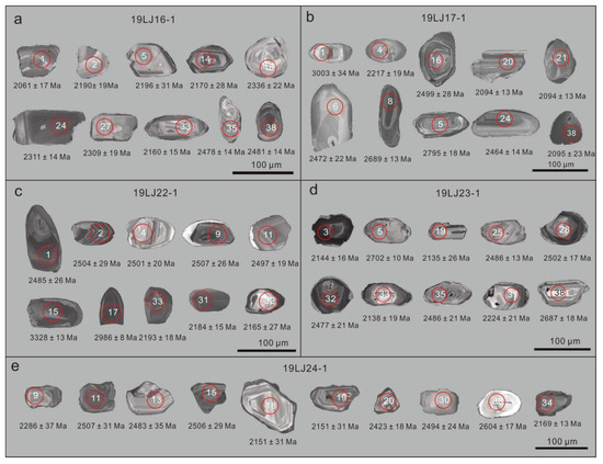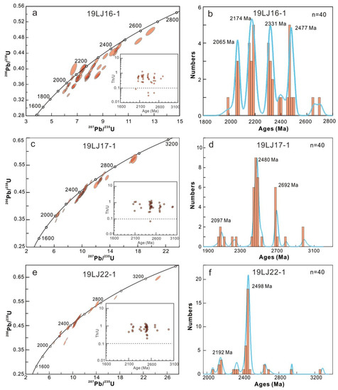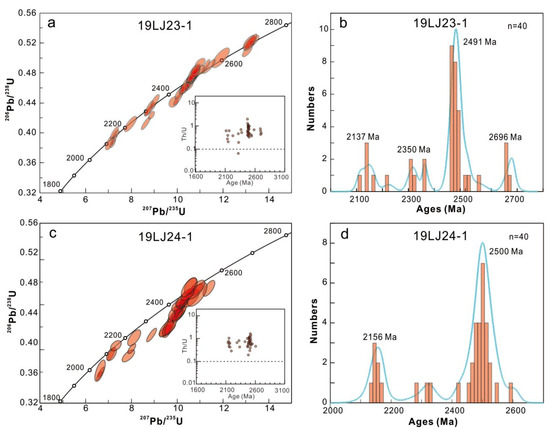 Zircons from sample 19LJ16-1 measure 40–100 μm in length and have aspect ratios of 1–2. The grains are subhedral and oval to columnar in shape. Most grains show clearly concentric oscillatory zoning in CL images (Figure 5a). Forty analytical spots yielded 207Pb/206Pb ages ranging from 2704 to 1998 Ma, with most Th/U ratios being larger than 0.1 (Supplementary Table S1 and Figure 6a). These ages can be divided into four age groups (Figure 6b): 2504–2415 Ma with a peak at 2477 Ma (n = 10), 2389–2309 Ma with a peak at 2331 Ma (n = 10), 2196–2152 Ma with a peak at 2174 Ma (n = 12), and 2075–2051 Ma with a peak at 2065 Ma (n = 6). The other three individual grains yielded ages of 1998, 2657, and 2704 Ma, respectively (Supplementary Table S1).