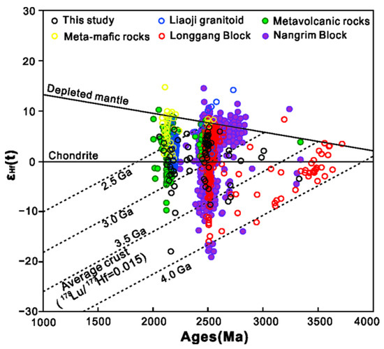 Diagram of εHf(t) vs. Ages (Ma) for samples from the Liaodong Peninsula. Previous data were compiled from the studies of [22,42,43,54,55,67,68,69,70,71,72,73,74,75,76,77,78].