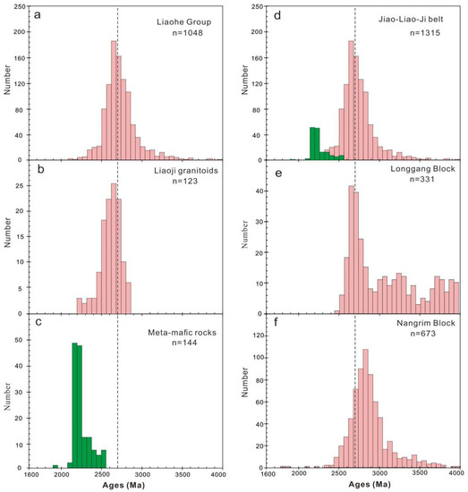Hf model age histograms for zircons from the Liaodong Peninsula. Previous data were compiled from the studies of [22,42,43,54,55,67,68,69,70,71,72,73,74,75,76,77,78].