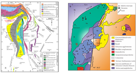 (a) Simplified tectonic map of northern Myanmar (modified after [12,13]); (b) geologic map of the Myanmar jadeite mining area (modified after [14,15]). Note: the red dot in (b) is the spot for Figure 2.