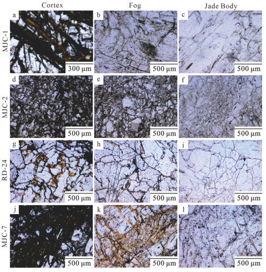 Parallel polarized photomicrographs of the samples from cortexes, intermediate parts and inner bodies of: (a–c) MJC-1; (d–f) MJC-2; (g–i) RD-24; and (j–l) MJC-7. Note: All the colorless minerals are jadeite.