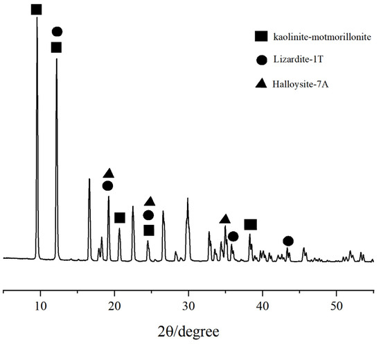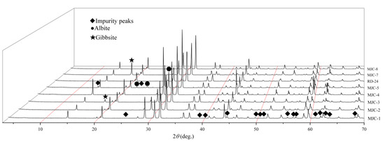 The main chemical compositions of the weathered cortexes and jade bodies were basically identical (Table 1). The dark clustered substance in the weathered cortex of MJC-3 (Figure 4) was determined to be gibbsite based on the XRD analysis results (Figure 6).
