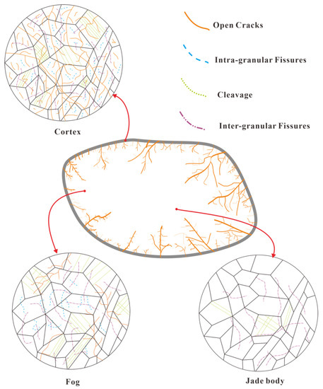 The existence of open cracks, widened gaps between grains, and cleavage fissures in the weathered cortexes of the Myanmar jadeitite clearly indicate that some elements and parts of the minerals may have been removed from the cortex, especially for the larger gaps at the intersections between open cracks (Figure 9).