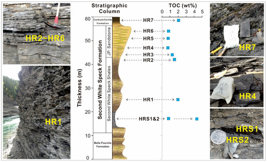 Stratigraphic column of the 2WS along Highwood River outcrop at southwestern Alberta (modified from Komaromi and Pedersen, 2014 [43]), sample location and photograph, together with measured total organic carbon content.