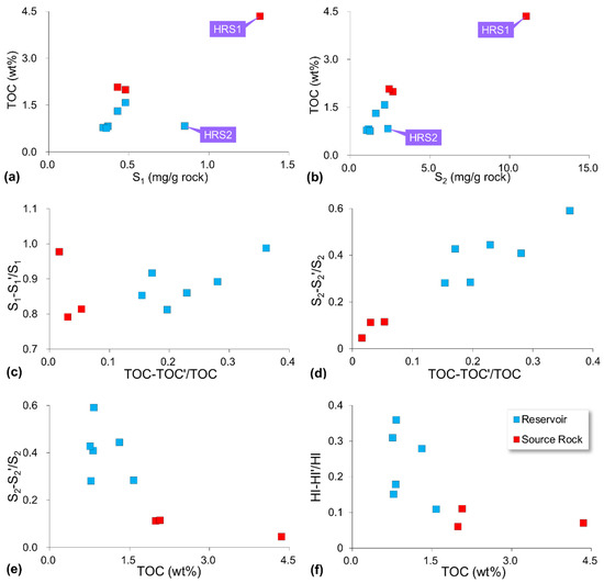 Correlation between S1 (a) and S2 (b) peak values with TOC contents. Change in S1, S2, HI and TOC contents in samples before and after solvent extraction. (c) Correlation between (S1–S1′)/S1 vs. (TOC–TOC’)/TOC; and (d) correlation between (S2–S2′)/S2 vs. (TOC–TOC’)/TOC. Correlation between (S2–S2′)/S2 vs. TOC contents (e) and HI-HI’/HI vs. TOC contents (f).