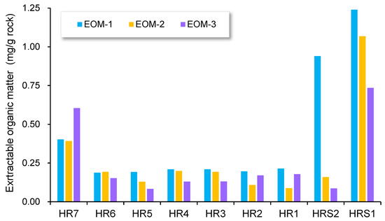 The sequential extraction results for the studied samples are shown in Figure 4. The total EOM content was in the range of 0.4–3.04 mg/g rock, with an average of 0.95 mg/g rock. The EOM-1 yield was in the range of 0.19–1.24 mg/g rock, and accounted for 44.1% of the total EOM content. The EOM-2 and EOM-3 yields varied in the ranges of 0.09–1.07 mg/g rock and 0.08–0.74 mg/g rock, and accounted for 29.4% and 26.4%, respectively. Two relatively fresh samples (HRS1 and 2) had much higher extractable organic matter than other samples, and the difference between each step was also much sharper. The source rock (HRS1) showed a gradual decrease of EOM yield from each step, corresponding to 40.7%, 35.1%, and 24.2% of total EOM, respectively, while the reservoir (HRS2) showed a strikingly different EOM yield from each step, corresponding to 79.3%, 13.4%, and 7.3% of total EOM, respectively. Other samples had much lower EOM yields, and displayed irregular patterns with extraction steps (Figure 4).