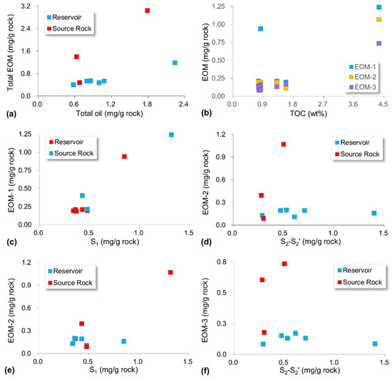 There was a generally positive correlation between the total EOM and total oil derived from the Rock-Eval pyrolysis. However, reservoirs contained more total oil than the total EOM, while source rocks displayed the opposite trend, where the total EOM was higher than the thermally desorbed oil (Figure 5a). The correlation between TOC and EOM is shown in Figure 5b. A positive correlation between each EOM and TOC can be observed, especially those between EOM-2, EOM-3, and TOC, suggesting that TOC content was the main constraint for adsorbed and residual oils. A linear correlation between EOM-1 and Rock-Eval S1 can be observed for the studied samples regardless of the lithology variation (Figure 5c). While EOM-2 can be considered as the adsorbed oil, and should be closely related to “S2 oil”, the overall correlation between them was weak. The reservoirs seemed to behave differently from the source rocks. A good correlation between EOM-2 and “S2 oil” can be observed for the source rock samples, but not for the reservoirs (Figure 5d). A similar relationship can be noted between EOM-2 and S1 (Figure 5e), but the correlation between EOM-3 and “S2 oil” was poor for both source rocks and reservoirs (Figure 5f).