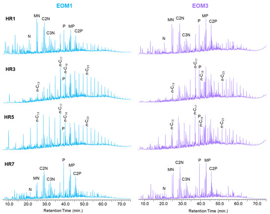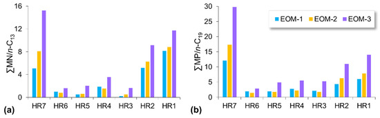 The GC–MS analyses of total the hydrocarbon fraction from free oil, adsorbed oil, and residual oil were performed on seven samples (HR1-7), while GC–MS analyses of saturated and aromatic hydrocarbon fractions were performed for all extracts. The total ion chromatograms (TIC) of the total hydrocarbon fraction illustrated conspicuous molecular composition differences between the source rock (represented by HR1 and HR7) and reservoir (represented by HR3 and HR5). Molecular compositions in the source rock extracts were characterized by the dominance of alkylnaphthalenes and alkylphenanthrenes, while n-alkanes and branched alkanes were largely masked. However, the molecular compositions in reservoir extracts were dominated by n-alkanes in the range of C13–C30, while alkylnaphthalenes and alkylphenanthrenes were less important constituents. The difference between free oil and residual was less dramatic than the variation from lithology, but was still perceptible. The relative abundance of GC amenable aromatic compounds was more concentrated in the EOM-3, and high molecular components were relatively enriched (Figure 6).