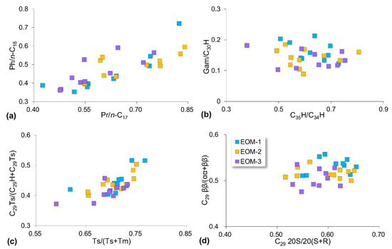 The C27 pentacyclic triterpane ratio, 18α(H)-22,29,30-trisnorneohopane (Ts) vs. 17α(H)-22,29,30-trisnorhopane (Tm), has been used extensively as an indicator of maturity in samples containing similar source materials. Tm is believed to represent the biologically produced structure, while Ts is formed during thermal maturation processes and exhibits a greater thermal stability than Tm (Peters et al., 2005 [49]). C29Ts (18α(H)-30-norneohopane) is characterized by a high thermal stability, and it has virtually the same geochemical behavior as Ts. With increasing thermal maturity, C29Ts shows a marked increase in apparent concentration relative to the C29 norhopane (C29H) (Peters et al., 2005 [49]). A clear positive correlation between Ts/(Ts + Tm) and C29Ts/(C29H + C29Ts) ratios was illustrated in the studied samples. While the difference was subtle, slightly lower ratios could be observed from the EOM-3 (Figure 7c).