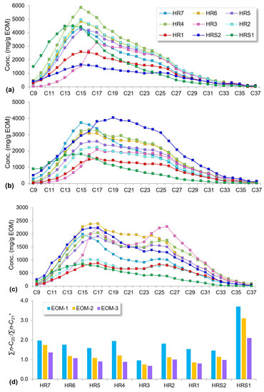 The n-alkanes are the most abundant components in oil, and their distributions reflect organic input and maturity level. The concentrations of individual n-alkane present in the sequential extraction samples are illustrated in Figure 9. A wide range of n-C9 to n-C37 alkanes without any odd-over-even carbon number predominance could be detected from all studied samples. The n-alkanes in EOM-1 were dominated by C13–C20 with a unimodal distribution and maximal peak at C15, except the HR3, which had the maximal peak at C17 (Figure 9a). The unimodal n-alkane distributions, generally peaking at C15 and C17, were indicative of a uniform source, where marine algae and bacterial lipids could be the major contributors of n-alkanes. The chromatograms of the EOM-2 samples also displayed a unimodal distribution pattern, but the relative proportion and heavy end increased perceptibly. The maximal peak in some samples was shifted to a slightly higher carbon number. For instance, the main carbon number in HRS2 was n-C19 (Figure 9b). Samples of EOM-3 were enriched in long-chain n-alkanes. A typical bimodal n-alkane distribution with a second maximum at n-C25 to n-C26 could be observed from HR1 and HR3 (Figure 9c). The n-alkanes’ pronounced fractionation effects according to molecular chain lengths could also be illustrated by the ∑C20−/∑C21+ ratio. Generally, low ∑C20−/∑C21+ ratios of outcrop samples may be caused by evaporative loss of light components during long weathering exposure. Systematic changes could be observed from the sequential extraction with the ∑C20−/∑C21+ ratios in EOM-1 > EOM-2 > EOM-3. The early extracts tended to have higher relative abundances of C9 to C20 n-alkanes (Figure 9d).