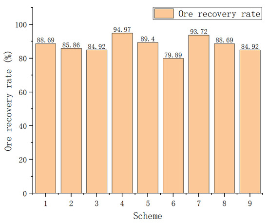 - The optimal structural parameters of the room and pillar method for the gently inclined medium-thick ore body are: stope height 4.5 m, pillar diameter 4 m, pillar spacing 7 m, and pillar row spacing 8 m. The onsite mining trial show that the optimized parameters are beneficial to realize the equilibrium of safety and economy, while the ore recovery rate reaches 82%.