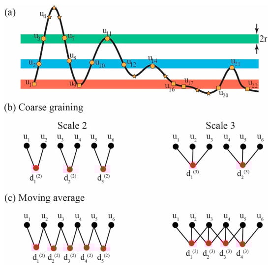 Single point computation of sample entropy can be unreliable, as the statistical properties of the time series changes with the decimating factor, which is called the scale factor. Therefore, sample entropy is computed at various scales to provide reliable entropy estimates [] and is known as multi-scale sample entropy (MSE). MSE works in two steps: in the first step, the time series is decimated by computing an average of non-overlapping consecutive points defined by scales ( τ ) (Figure 3b). This process is known as coarse-graining. For a given time series with n points u 1 , u 2 , u 3 , …, u n . The coarse-grained time series ( d ) at scale ( τ ) is obtained by,