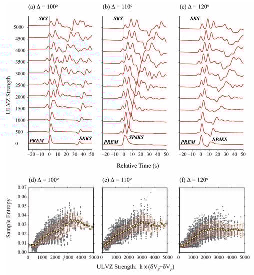 Figure 3. Example synthetic seismograms for 1-D models of ULVZs at epicentral distances of (a) 100°, (b) 110°, and (c) 120° are shown. All synthetics are radial component displacement synthetics aligned on the PREM predicted SKS arrival time and normalized in amplitude to unity. Seismograms are organized from low to high ULVZ strength from bottom to top. Synthetics shown are for models that all have ULVZ thickness (h) = 50 km, and δρ = +10%. The bottom trace (PREM) has δVS = −0% and δVP = −0%. Each trace going upward has an additional decrease in δVS and δVP of 5%. For example, the 2nd trace from the bottom has δVS = −5% and δVP = −5%. The 3rd trace from the bottom has δVS = −10% and δVP = −10%. The top-most trace has δVS = −50% and δVP = −50%. The sample entropy of all 1-D ULVZ models are shown at epicentral distances of (d) 100°, (e) 110°, and (f) 120°. The individual measurements are shown with gray circles, and the average (yellow squares) and 1–σ range (red bars) are shown in windows of ULVZ strength of 250%·km.