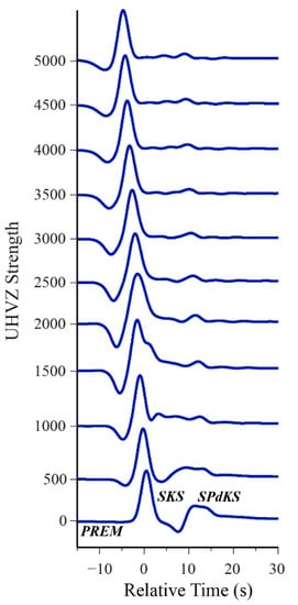 We computed seismograms for 1-D synthetic models using the full waveform reflectivity technique [,]. We considered various models to test the full range of expected low-velocity and ultra-low velocity parameters. For ULVZ models, we simulated SKS/SPdKS waveforms for the following parameters (1) S-wave velocity perturbation (δVS) varied from −50 to 0% in 5% increments (all percentages reported with respect to the PREM model []), (2) P-wave velocity perturbation (δVP) varied from −50 to 0% in 5% increments, (3) ULVZ height varied from 0 to 50 km in 5 km increments, (4) density perturbation (δρ) varied from −20% to +30% in 10% increments. In total, this gave us 3961 unique 1-D models. We also computed synthetics for an identical suite of high velocity and ultra-high velocity parameters, which only differed in that δVS varied from 0 to +50% in 5% increments and δVP varied from 0 to +50% in 5% increments. As a result, we have an additional 3961 high velocity models. All synthetics were computed for a 500 km source depth. We chose larger event depths to ensure that depth phases such as sSKS do not interfere with our measurements. UHVZ models are computed to S-wave velocity increases of up to 50% in symmetry with the ULVZ models; however, the largest reported S-wave velocity increases are on the order of +20%, which could be related to diamond-bearing structures [].