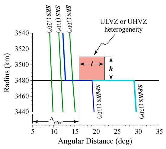 Figure 5. Schematic drawing of box-car ULVZ or UHVZ heterogeneity. The heterogeneity is drawn as the red box with height (h) and length (l) in the great circle arc direction. The left-most edge of the heterogeneity is located at an angular distance of Δedge away from the line connecting the source to the center of the Earth. Ray paths for the SKS arrival are drawn for epicentral distances of 100°, 110°, and 120° in green. Ray paths for the SPdKS arrival are drawn for epicentral distances of 110° (purple) and 120° (cyan).