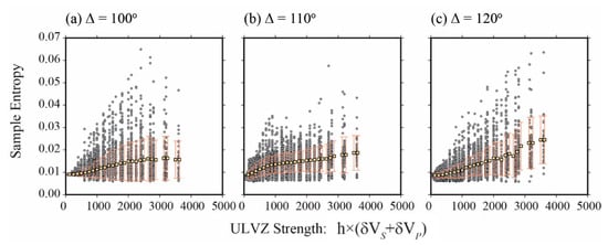 Figure 6. The sample entropy of all 2.5-D ULVZ models are shown at epicentral distances of (a) 100°, (b) 110°, and (c) 120° as a function of ULVZ strength. The individual measurements are shown with gray circles, and the average (yellow squares) and 1–σ range (red bars) are shown in windows of ULVZ strength of 250%·km.