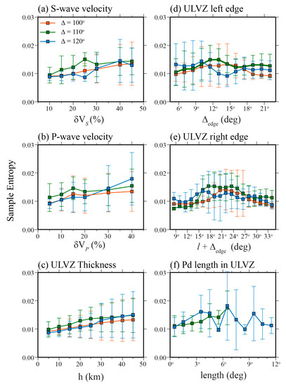 Figure 7. Variation of sample entropy with 2.5-D ULVZ parameters. The sample entropy is shown for synthetic seismograms as a function of (a) S-wave velocity, (b) P-wave velocity, (c) ULVZ thickness, (d) the leftmost edge of the ULVZ, referred to as Δedge in the text, (e) the right-most edge of the ULVZ, which corresponds to l plus Δedge, and (f) the length of the Pd portion of SPdKS that travels within the ULVZ. In all panels the answers are shown for synthetics at epicentral distance of Δ = 100° (red lines and squares), Δ = 110° (green lines and squares), Δ = 120° (blue lines and squares). The error bars show 1-σ standard deviation.