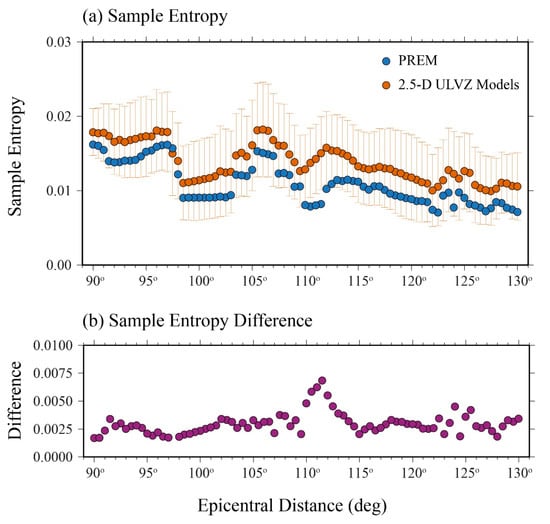 Figure 8. Sample entropy as a function of epicentral distance. (a) The SE is shown for the PREM model (blue circles) and the average of all 2.5-D ULVZ models (orange circles) with error bars showing the standard deviation. (b) The difference in SE between the average ULVZ values and PREM is shown (purple circles).