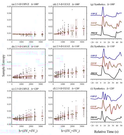 Figure 9. Sample entropy for a coarsely sampled UHVZ and ULVZ model space of 430 models. (ac) Sample entropy is shown for UHVZs as a function of UHVZ strength. Individual measurements are shown with gray circles and averages in 125 km% increments are shown with red boxes and 1-σ standard deviation error bars are drawn. (df) show the same except for ULVZ models. Sample entropy is shown for synthetic seismograms at a single epicentral distance of (a,d) Δ = 100°, (b,e) Δ = 110°, and (c,f) Δ = 120°. Example radial component displacement synthetic seismograms are shown in panels (gi) for the PREM model (black), a ULVZ model with δVS = −40%, δVP = −40%, h = 40 km, l = 6°, and Δedge = 17° (red), and a UHVZ model with δVS = +40%, δVP = +40%, h = 40 km, l = 6°, and Δedge = 17° (blue).