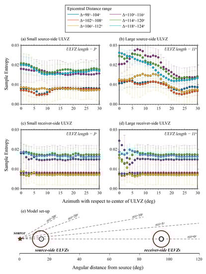 It is now possible to compute synthetic seismograms at high frequencies for fully 3-D ULVZ models. Thorne et al. [] showed synthetic seismograms for four disk-shaped ULVZ models. These synthetics were computed for small (l = 3°) or large (l = 11°) ULVZs located on either the source- or receiver-side of the path (Figure 10e). We computed the SE for these four models and display the results as a function of azimuth in Figure 10. Here, an azimuth of 0° is for the great circle path which passes through the center of the ULVZ. Seismograms were computed for azimuths from 0° to 30° with respect to a great circle arc path passing through the center of the ULVZ. A Pdiff ray at an azimuth of 30° passes just outside of the larger (l = 11°) ULVZ. Results are grouped into six epicentral distance bands. The relationship between azimuth and SE is complex, but we can summarize the results as follows. (1) For a small source-side ULVZ, we can see effects on the SE for a wide range of azimuths. For example, for distances larger than roughly 110°, we see an increase in sample entropy at an azimuth of 0°, which decreases to approximately the baseline entropy level around an azimuth of 11°. (2) For a large source-side, ULVZ perturbations to the SE can be observed at almost all azimuths considered. Here, the SE does not appear to start leveling off until an azimuth of about 25°. (3) For a small receiver-side ULVZ, there is little effect on the SE, although a slight increase from the baseline levels may be seen at azimuths from approximately 0°–5° for the larger epicentral distances. (4) For a large receiver-side ULVZ, we see a significant effect on the SE, albeit on narrower range of azimuths than for the source-side ULVZ. From these observations, we may suggest, similarly to SPdKS waveform effects, SE increases are more likely to be observed for ULVZs that exist on the source-side of the path. However, a large ULVZ on the receiver-side of the path may also introduce an SE increase that can be measured on more than a single seismic receiver.