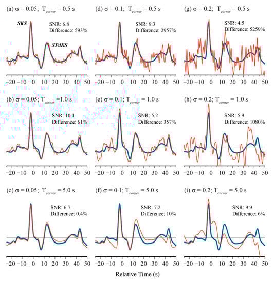 where T c o r n e r is the corner period and σ is the standard deviation, or root-mean square (RMS) of the noise. For periods less than T c o r n e r , the amplitude of the noise decays as governed by the Gaussian function. Some examples of noisy seismograms generated in this manner are shown in Figure 11. In this example, we repeat in all panels a single synthetic seismogram, drawn in blue, without added noise computed for a 2.5-D ULVZ model at an epicentral distance of 120°. Each column of this figure shows increasing noise amplitude ( σ   = 0.05, 0.1, and 0.2), and each row shows increasing period of the correlation length ( T c o r n e r = 0.5, 1, and 5 s). We measured the SE of each trace and report the percent difference between noisy and clean signal. In addition, we estimated the signal-to-noise ratio (SNR) of each noisy synthetic because the SNR is a commonly used metric of signal quality. As can be seen in this Figure, simple use of a SNR is not an adequate measure of how well the SE method might perform. For example, we show a case in Figure 11a where we have low noise amplitude at high frequency. This case gives us a SNR of 6.8 and a percent difference in SE of 593%. However, we obtain a percent difference in SE of only 0.4% for a similar SNR of 6.7 that has longer period noise (Figure 11c). This demonstrates that SE measurements made on seismograms with longer period and lower amplitude noise are more similar to that without noise. Thus, in order to determine which seismic data to use in measuring SE, we should consider both amplitude and period of noise present.