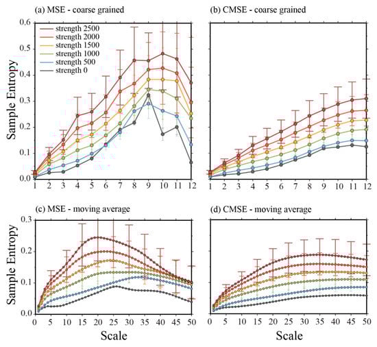 Figure 13. (a) MSE using a coarse-graining approach. (b) CMSE using a coarse-graining approach. (c) MSE using a moving average approach. (d) CMSE using a moving average approach. In each panel, the average of the sample entropy is shown for 1-D synthetic seismograms where they are grouped by ULVZ strength. Here, we show results for strengths binned from 0–250 (gray), 500 ± 250 (light blue), 1000 ± 250 (green), 1500 ± 250 (orange), 2000 ± 250 (red), 2500 ± 250 (dark red). One standard deviation error bars are shown in panels (a,b) but are only shown for every 5 scales in panels (c,d) to increase clarity.