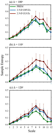 In this study we explore an alternate method to characterizing ULVZ existence that may have sensitivity at a wider epicentral distance range than utilized in Thorne et al. [,]. In this paper, we measure the waveforms complexity assuming that as the seismic waveform interacts with ULVZ structure, the ensuing scattering of seismic energy leads to a more irregular waveform. Here, we estimate waveform complexity by measuring the multi-scale sample entropy (MSE) of the time series [,]. The method is based on the sample entropy (SE) approach first introduced by Richman and Moorman (2000) but is computed at different decimating factors (defined as scale). For a fixed scale, waveforms with higher complexity produce a higher value of sample entropy, while signals with a higher degree of regularity (i.e., lower complexity) yield lower values of entropy. This approach has been regularly applied in health sciences to discriminate between states of health in individual. For example, measurements of irregularity in an individual’s heart beat could be an indicator of poor heart health [,,,]. However, variations of the SE approach have been applied in a wide variety of settings such as in analyzing climate data [] and structural health monitoring of buildings []. To our knowledge, this approach has not yet been applied to seismic data to characterize waveform complexity.