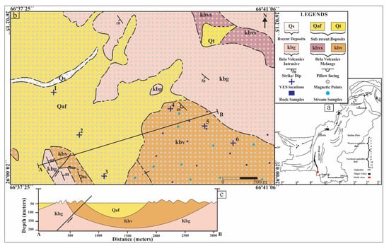 This study is mainly focused on the exploration of metallic minerals hosted in mafic and ultramafic rocks of the BOC, based on the qualitative and quantitative analysis of field data for the magnetic and IP/resistivity targeting of the aeromagnetic anomaly [22]. A geophysical study on BOC was carried out for the first time to investigate the mineral potential. In addition, the mineralization type determined by the magnetic anomaly was confirmed by geochemical investigation of the rock and stream sediments samples. Figure 1 shows the studied region is a part of the Bela Ophiolitic band and is located between latitudes 26°00′02″ and 26°02′15″ E and longitudes 66°37′25″ and 66°41′06″ N, 20 km from Uthal, Lasbela District, Baluchistan, Pakistan. The lithological units exposed in the study area are Bela volcanic melange (Kbv), lava flow (Kbvs), Bela intrusive (Kbg), Aeolian sand (Qt), streambed deposits (Qaf), and Quaternary alluvium (Qs) [13].