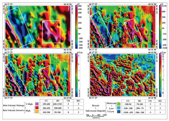The Vertical Derivative (VD) filter is used to enhance and refine the magnetic signature, while the first-order vertical filter is used to reduce noise from the ultramafic sequence and sharpen magnetic anomalies reflecting mineralized locations [41]. Figure 3c shows the VD map with high-anomalous zones as delineated by the TMA and RTP maps. The VD value varies from −3 to 2, with −3 representing low-anomalous zones and 2 representing high-anomalous zones, with the background ultramafic sequence having a value of 0 to 1, and the chaotic Bela sequence having a value of −1 to −2. Due to the high noise levels caused by the BOC’s strong ultramafic sequence, the VD filter enhances the high and low-anomalous zones, clearly defining the sharp contact between them. These high and low-anomalous zones are probable indicators of a mineralized source.