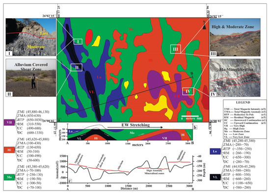 Since the magnetic data only provide a rough concept of the geology and structure of the target region, filtering must be employed to improve the quality, sharpness, and trend of the magnetic anomalies to help in interpretation. Filtering procedures such as TMA, RTP, RM, UC, and DC generation are used to obtain an overall trend of magnetic signatures with a sharpening of magnetic anomalies, excluding them from ultramafic basement structures. The magnetic potential map is created, representing the general trend of the ophiolites sequence and five magnetic signatures (Very High (VH), High (Hi), Moderate (Mo), Low (Lo), and Very Low (VL). To comprehend the tectonic setup of the study area, Figure 4 shows a magnetic cross section prepared along the traverse (A-B) to a potential depth of 200 m, employing the magnetic behavior of the strata. The VH magnetic signature with magnetic intensities ranging from 45,880 nT to 46,130 nT and magnetic values ranging from 310 nT to 1330 nT corresponds to metallic mineralization. The Hi magnetic signatures are Bela volcanic melange and Bela volcanic intrusive basalt, dolerite/gabbroic sills, and the pillow-lava sequence. The magnetic behavior of the Hi zone ranges from 50 nT to 490 nT, with intensities ranging from 45,620 nT to 45,880 nT. The Mo zone refers to the background value of BOC and corresponds to a chaotic sequence of Bela volcanic melange and intrusive with a mixed assemblage of marine limestone, shale, chert, pillow-lava, and basaltic sequences. The magnetic value of the Mo zone varies from −300 nT to 130 nT with an intensity ranging from 45,380 nT to 45,680 nT. The Lo zone corresponds to a Bela volcanic melange sedimentary sequence, dominated by limestone, shale, and chert having magnetic intensities ranging from 45,280 nT to 45,380 nT, with anomalies ranging from −650 nT to −70 nT. The VL zone is an anomalous zone with very low-magnetic behavior that corresponds to shaley or clayey strata. The magnetic intensity of this zone ranges from 44,920 nT to 45,280 nT, with an anomalous value of −1100 nT to −260 nT. The magnetic cross section (A-B) shows the same trends as the geological cross section illustrated in Figure 1.