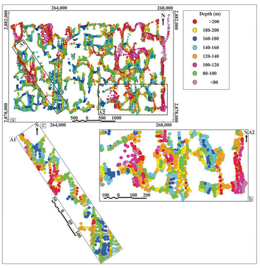 The Euler deconvolution uses the structural indices (SI), magnetic contrast, and horizontal and vertical gradient to calculate the depth of the causative boding causing the anomaly [44,45]. The window size used for Euler deconvolution is 5 × 5 data points, while SIs of 2 (for thin-bed fault), 1 (for dyke, sill, and intrusion), and 0.5 (for magnetic fault) are adopted [46,47]. The entire depth spans from 100 m to 200 m, with the majority of depths ranging from 150–200 m. The deeper sequence extends to more than 200 m and has total coverage of 30%, with the intermediate (200 to 150 m) at 50%, the low to medium (100 to 150 m) at 15%, and the low depth (100 m) at 5%. Figure 5c shows that the low zone (A1) with low-magnetic values extends from <80 m to >200 m, with the majority of the structure dipping to the SE side at a depth of 140–160 m. The NW side is a shallow, low-dipping structure with a depth range of 120–80 m.
